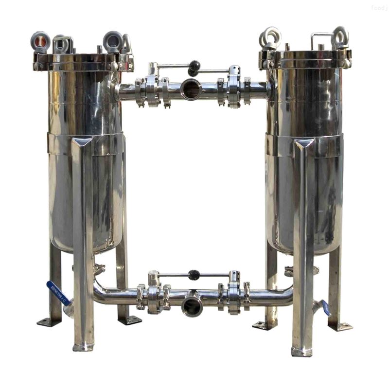 袋式双联过滤器,双联过滤器又称并联切换过滤器,它是由两台不锈钢过滤器并联而成,也可多台互联。采用两个三通球阀,将两个单筒过滤器组装在一个机座上。清洗过滤器时不必停车,保证其连续工作,是不停车生产线过滤装置的优选。